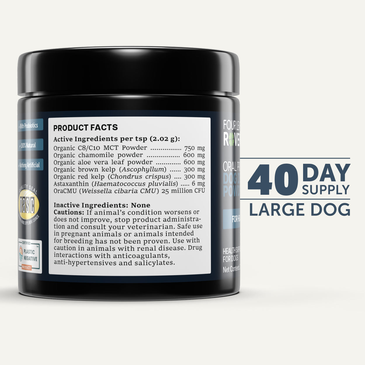 Organic Chamomile Powder: This gentle, anti-inflammatory herb helps soothe gums and support oral tissue health, making it ideal for dogs with sensitive mouths or early signs of gingivitis.