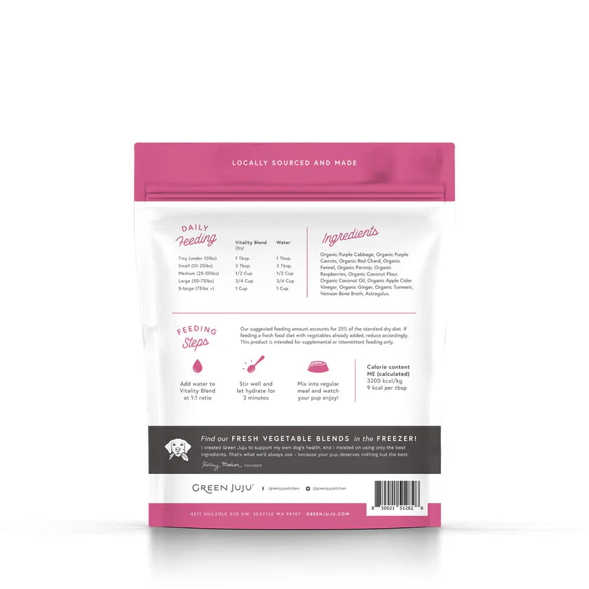 Vitality Blend with Astragalus is a powerful fusion of vibrant pink and purple fruits and vegetables combined with wild-harvested venison bone broth. Formulated to support digestion, enhance gut biodiversity, and strengthen immune health, it’s especially beneficial for senior dogs and cats or those needing extra resilience.