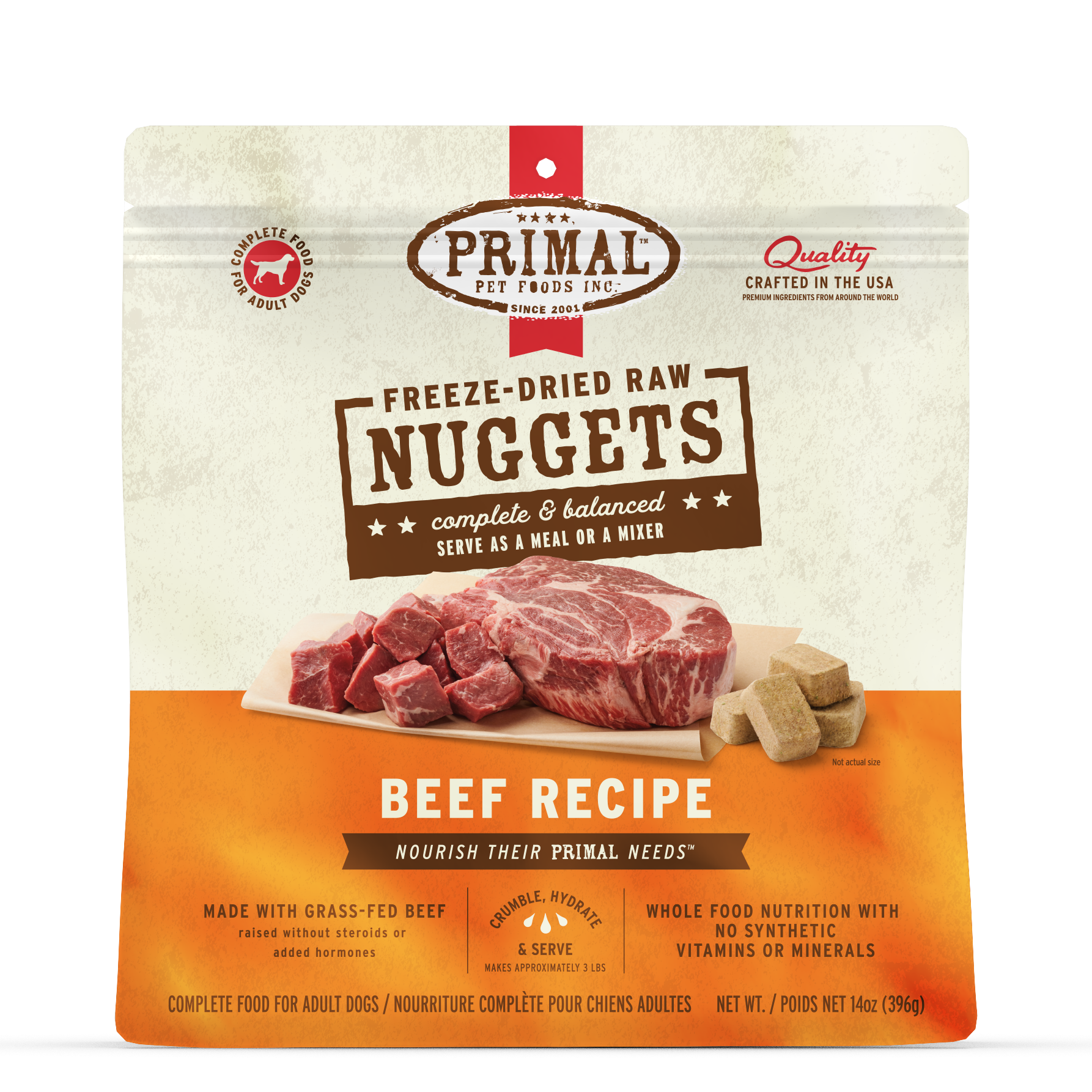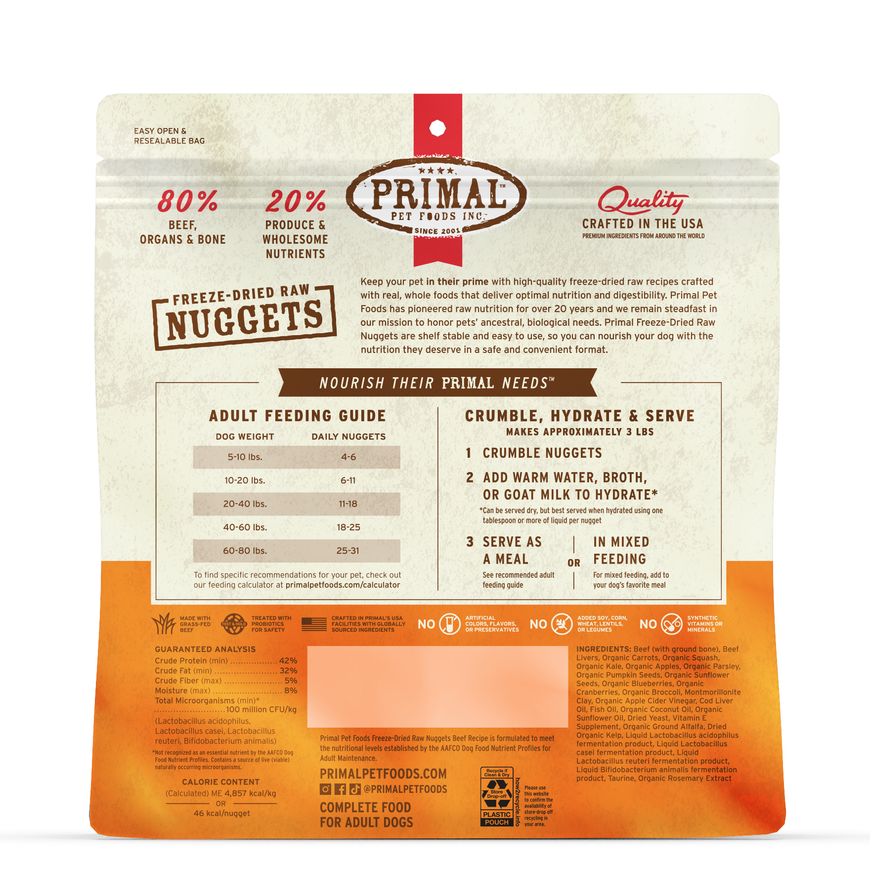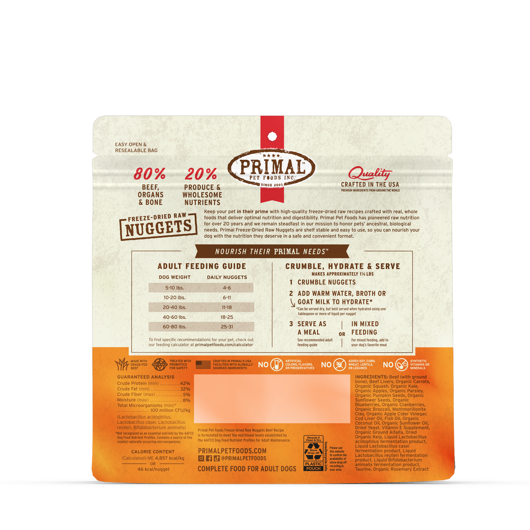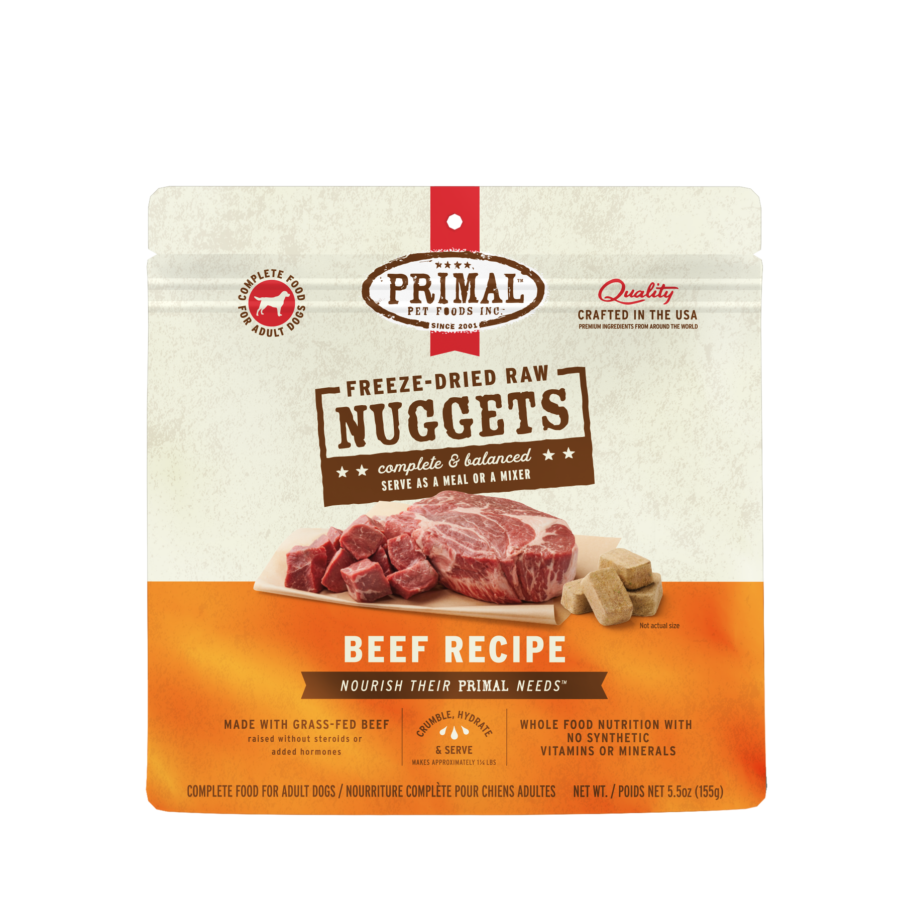 Crafted with 100% grass-fed beef, this food is free from added hormones and steroids. Freeze-dried raw with minimal processing, the Primal Nuggets preserve vital nutrients, locking in the nutrients dogs need. This is a highly digestible food that supports gut health much better compared to kibble or foods cooked at high heat. There are no synthetic vitamins or minerals added.
