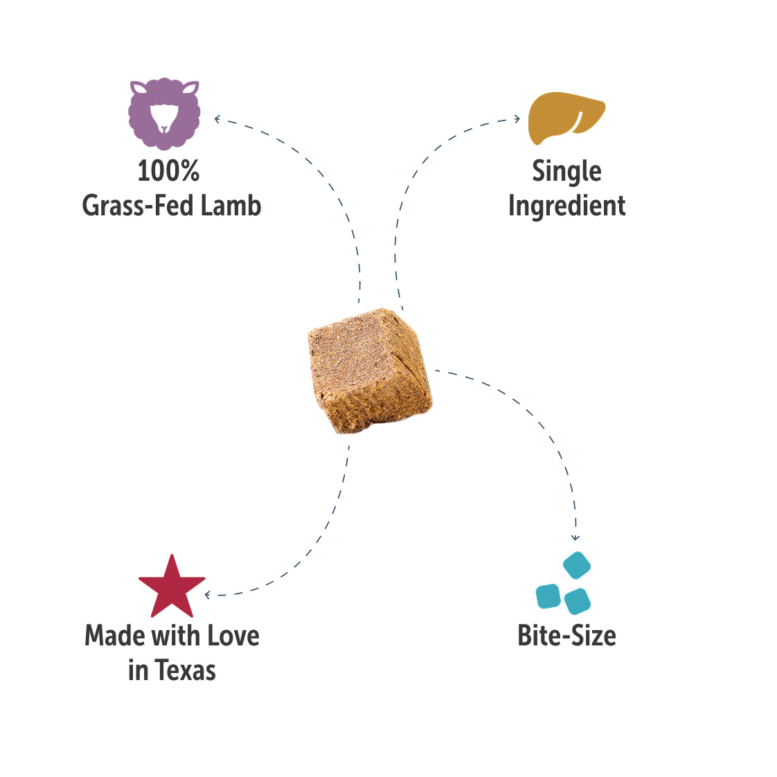 Premium, all-natural Lamb Liver treats are densely packed with protein and nutrients. These freeze-dried, bite-sized cubes are the perfect way to tell your dog, “I love you!”