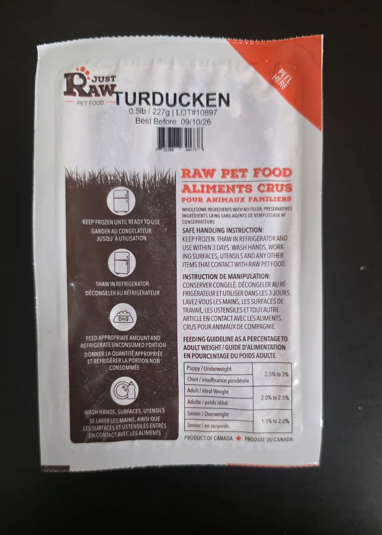 Experience the unbeatable combination of turkey, duck, and chicken with Just Raw - Turducken. Perfect for Thanksgiving and everyday meals, locally sourced and hormone and antibiotic-free ingredients ensure superior quality. Give your dog the fresh and nutritious meal they deserve with Just Raw - Turducken.