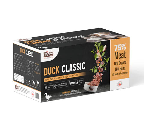 Just Raw's Duck dinner uses human grade, hormone-free and antibiotic free duck. It is a good alternative protein for dogs who are allergic to chicken. Duck has a different flavour profile so it will keep your dog excited for each meal!